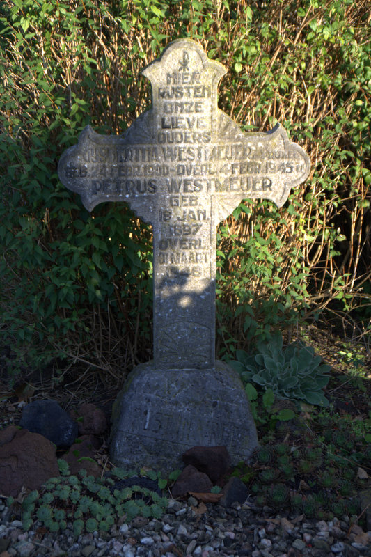 The (translated) inscription on this stone: Here rest our dear parents Gijsbertha Westmeijer-Prijkel, born 24 February 1900, died 4 February 1945, and Petrus Westmeijer, born 18 January 1897, died 1 March 1948. On the pedestal is inscribed Rust in vrede (Rest in peace).